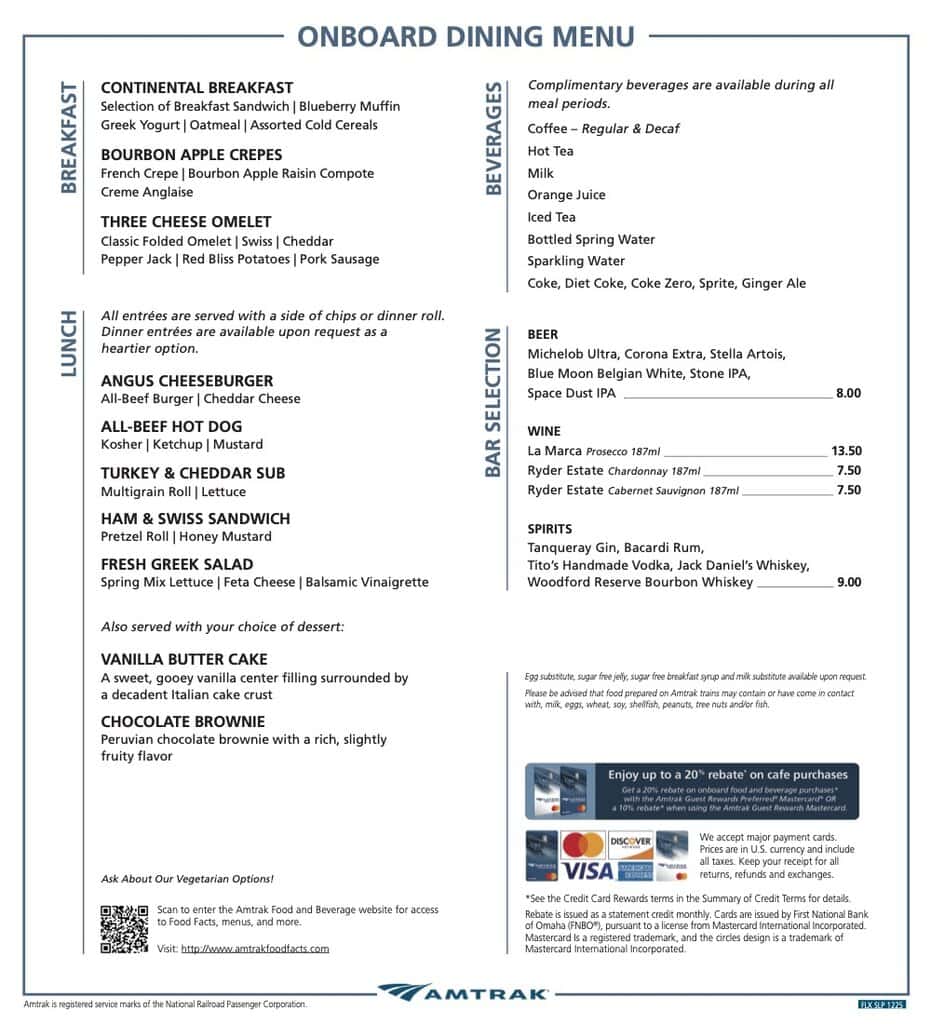 Flex Dining is Amtrak’s simplified dining program offered on select long distance trains. Meals are included for passengers traveling in sleeping car accommodations, while coach passengers may purchase meals from the same menu if seating is available in the dining car.