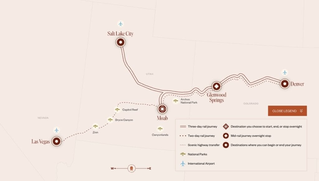 The new three-day Rockies to the Red Rocks Extension journey begins operating on April 21, 2026. It will travel weekly with one westbound departure from Denver and one eastbound departure from Salt Lake City.